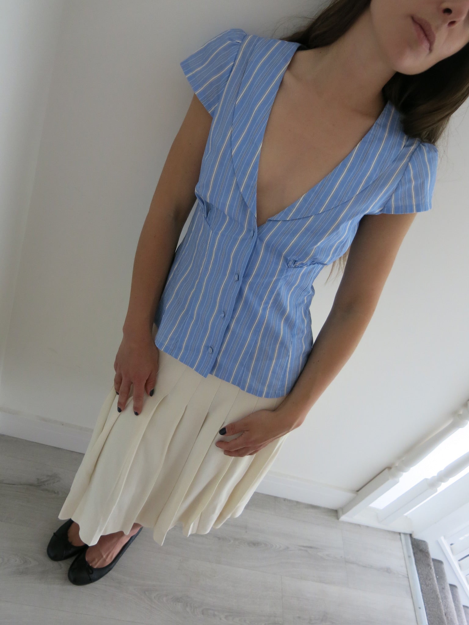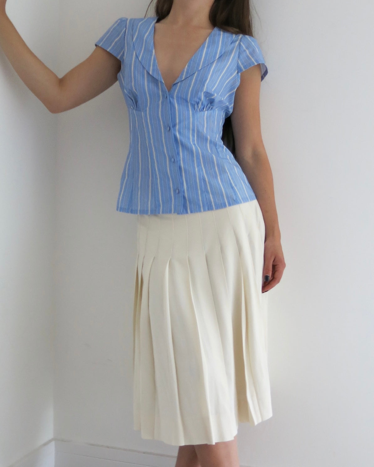 100% Dead-stock Cotton blouse with capped sleeves that sit away from the armpit. Four buttons down the center to close the Blouse. We recommend taking your usual size. If you have a fuller bust, consider sizing up for the best fit.
